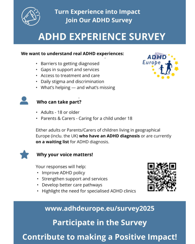 The aim of this survey is to understand the experiences of people with ADHD across Europe, including : Exploring the barriers to diagnosis and challenges faced : Identifying existing and missing support for living with ADHD : Driving pathways to care for treatments & psychological well-being : Examining the lived experience of facing stigma on a daily basis : Understanding when discrimination occurs.